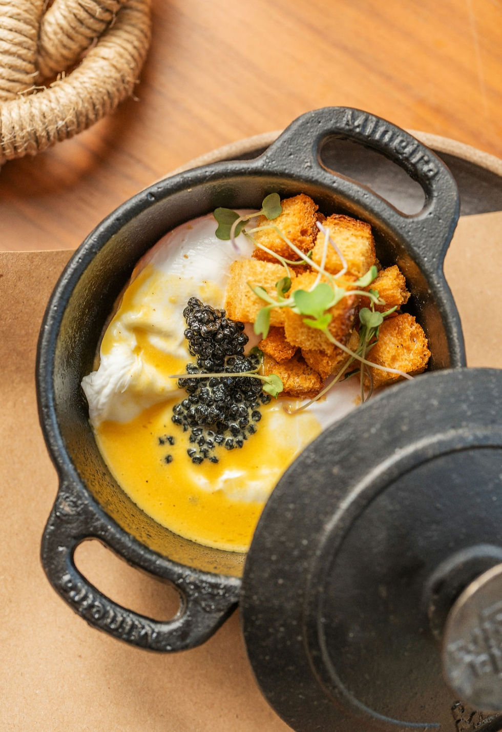 Panelinha com ovos poché, emulsão de tucupi e caviar, foto Crédito para Marketing Hotel Suryaa